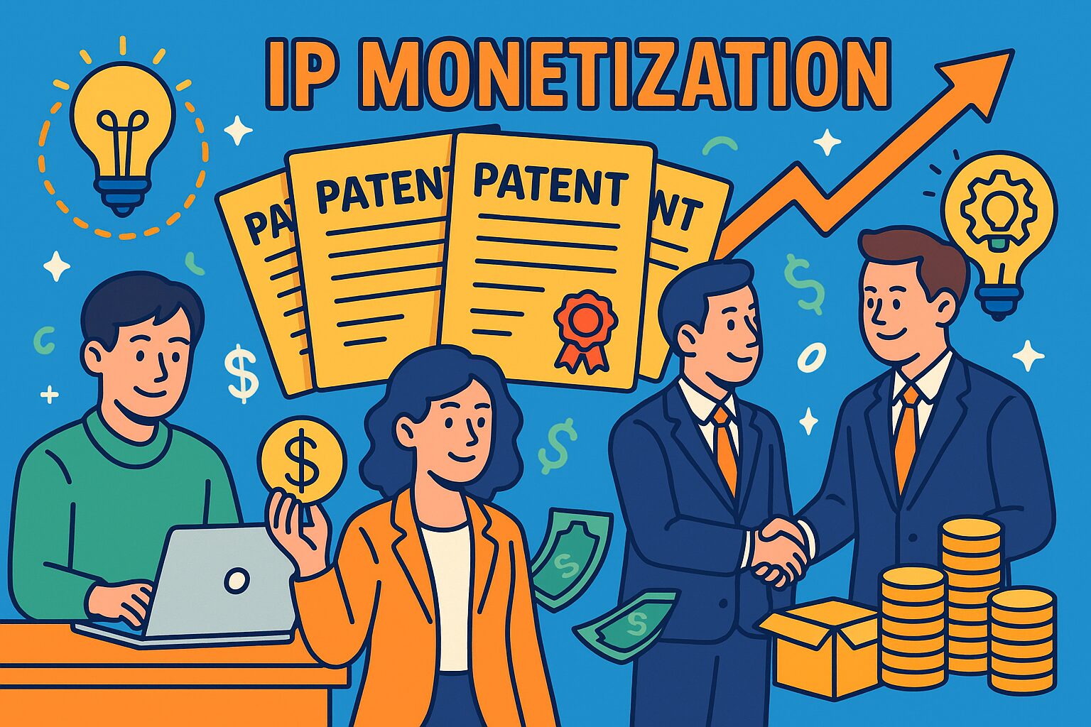 知的財産の収益化とは、特許や商標、著作権など企業が保有する知的財産権を活用して収入を得ることです。従来、知財は自社製品・サービスを守る「防御」の手段と考えられがちでした。しかし近年では、知財を戦略的に「攻め」に使い、新たな収益源とする動きが広がっています。知財の収益化手法には、他社へのライセンス供与によるロイヤリティ収入、特許そのものの売却による一時金の獲得、自社での製品化による売上増など様々なモデルがあります。自社で活用しない特許であってもライセンス売却により価値を生み出せる可能性があり、眠っている知財を「宝の持ち腐れ」にしないことが重要です。