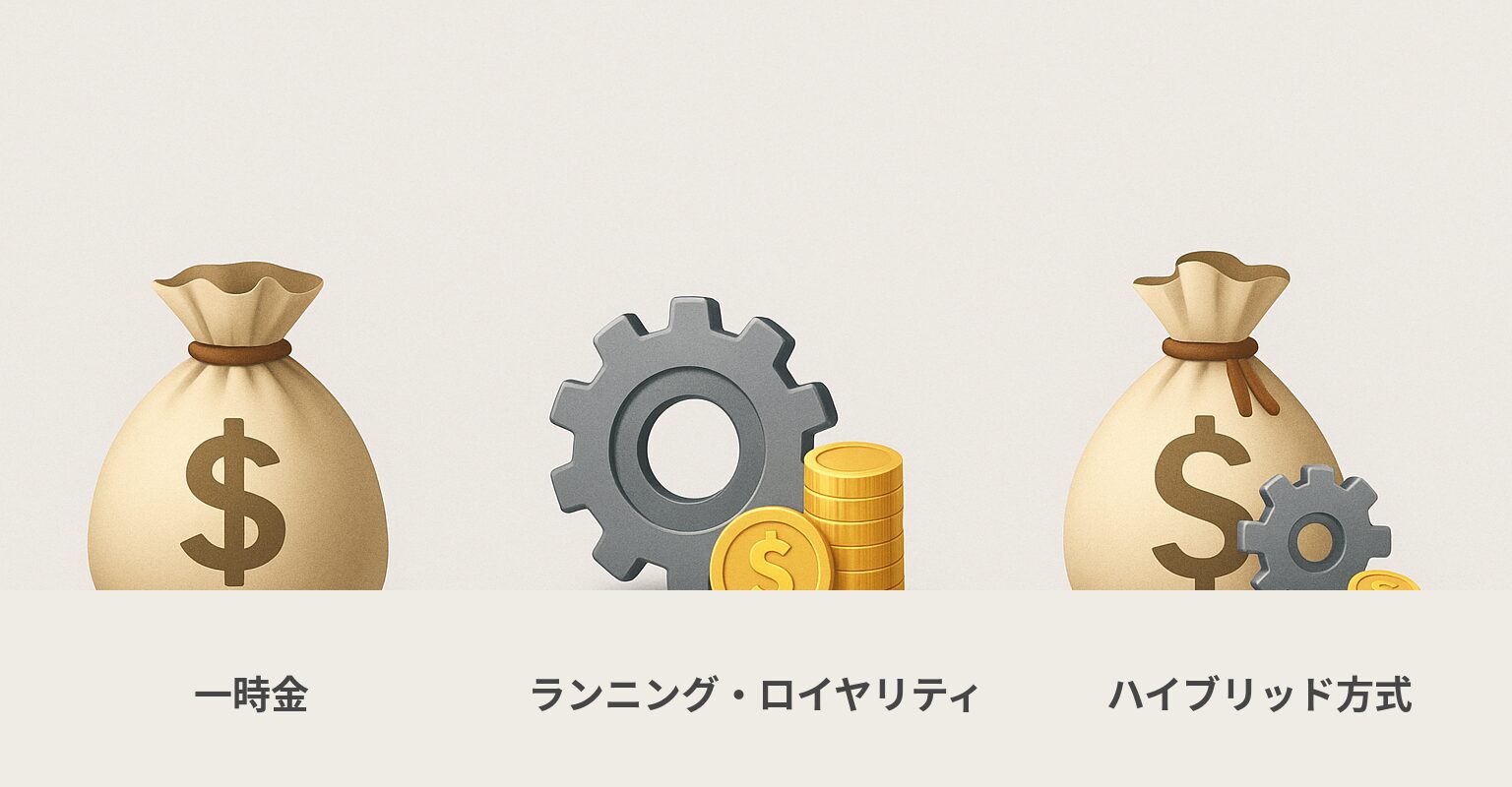 - 一時金(Lump-Sum / Initial Payment) 契約締結時に、まとまった金額を一括で支払う方式です 。計算がシンプルで、ライセンサーは将来の売上に関わらず安定した収入を確保できるメリットがあります。一方で、もし製品が大ヒットしても追加の収益は得られないという側面もあります 。