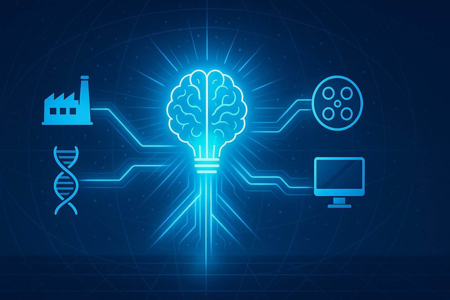 A sleek, abstract digital art piece. A glowing, intricate brain icon, representing ideas and intellectual property, is at the center. From this central brain, luminous data streams and network lines flow outwards, connecting to various industry icons (a factory, a DNA helix, a film reel, a computer screen). The background is a dark blue, futuristic grid, suggesting a global economic network. The overall style is clean, professional, and high-tech, conveying the idea that IP is the central hub of the modern economy.