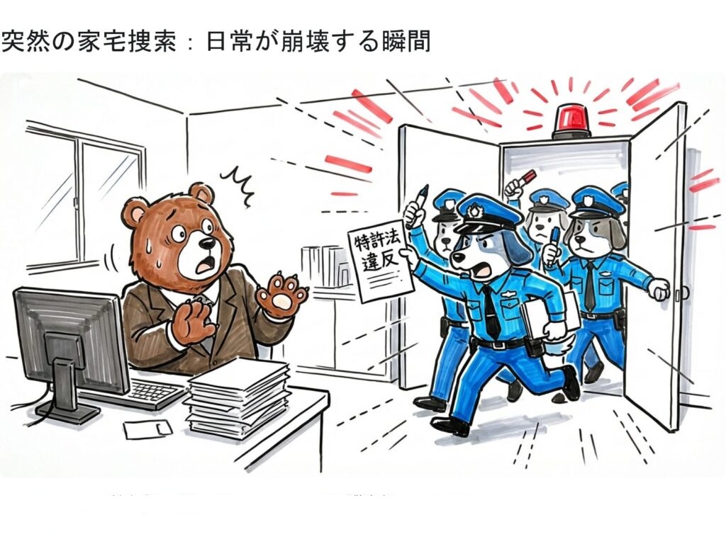 ドラマや映画の中だけの出来事だと思っていた光景が、現実の執務室で繰り広げられました。押し入ってきたのは、鋭い眼光の捜査員たち。彼らが突きつけた令状には、殺人でも横領でもなく、耳慣れない、しかし経営者の背筋を凍らせる罪名が記されていました。「特許法違反」。