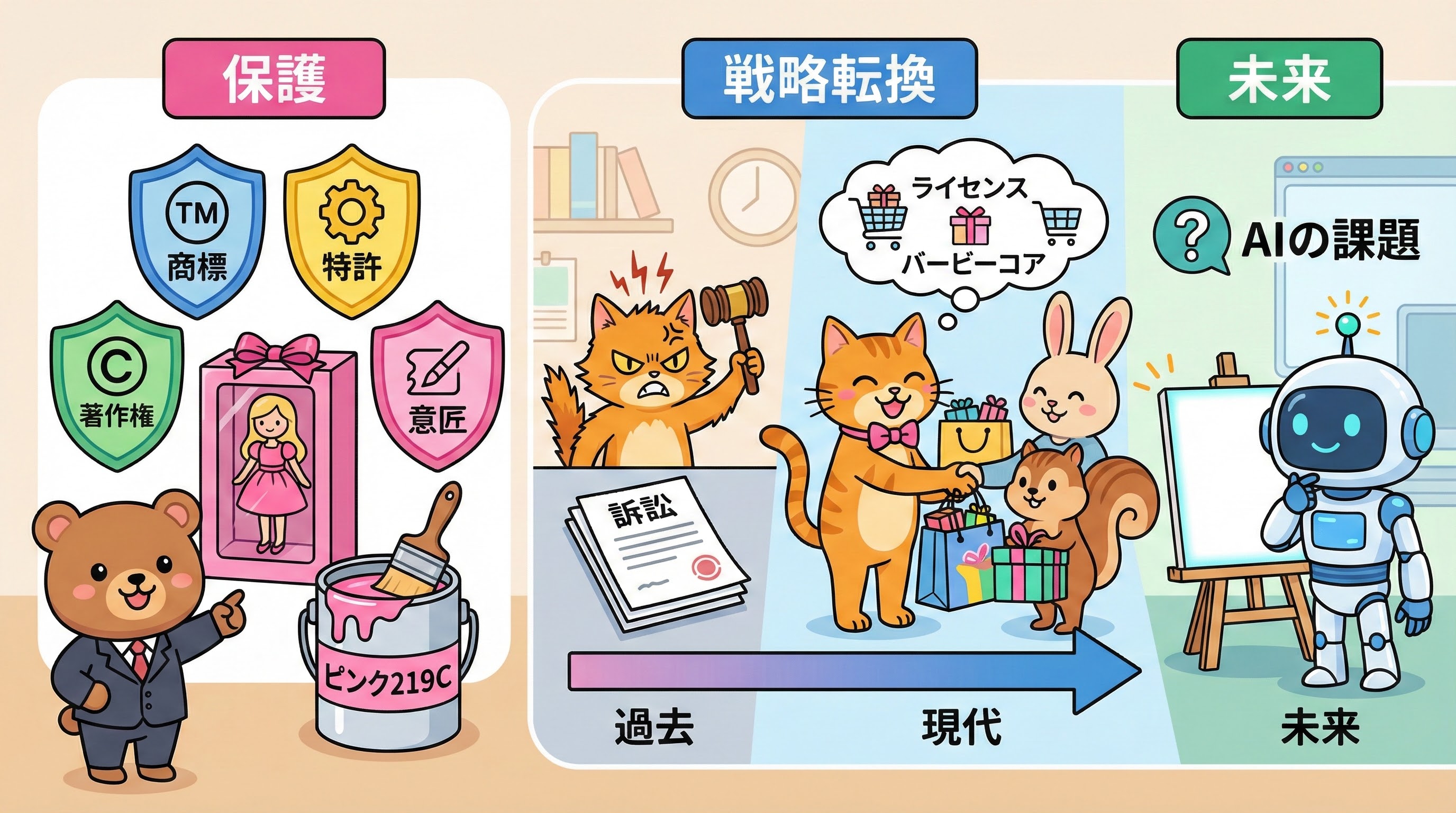 バービーの成功の根底には、発売当初から計算された緻密な知財戦略があります。アイデアそのものは著作権法では保護されませんが、その具体的な「表現」は、特許、意匠、商標、著作権という4つの主要な権利によって強力に保護されています 。