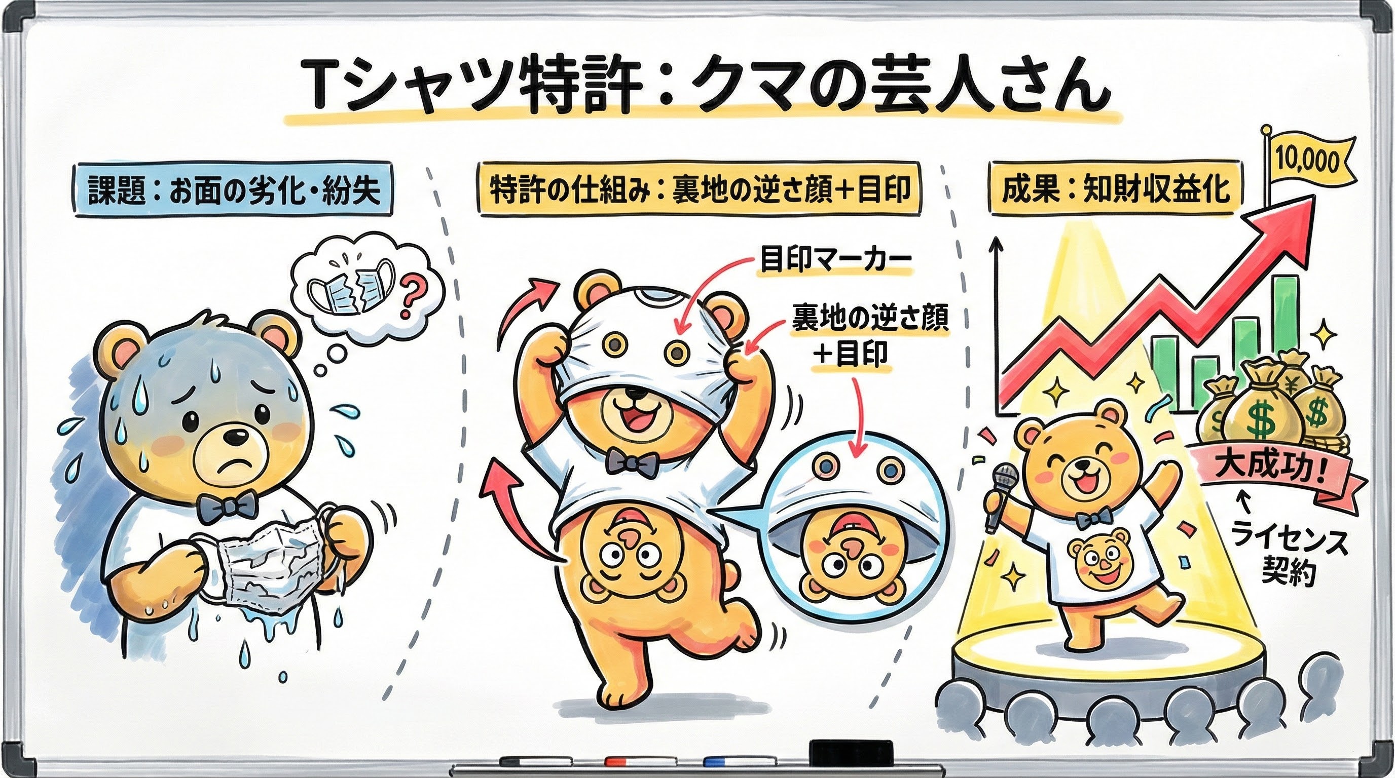 特許は、ハイテク企業や大メーカーだけのものではありません。日常のちょっとした「笑い」を生むための工夫であっても、そこに新規性と進歩性があれば、立派な資産となります。秋山氏のTシャツは、1枚数千円の商品ですが、1万枚売れれば数千万円の売上規模になります。さらに、その認知度を活用したテレビ出演やイベント出演などの波及効果を含めれば、その経済効果は計り知れません。