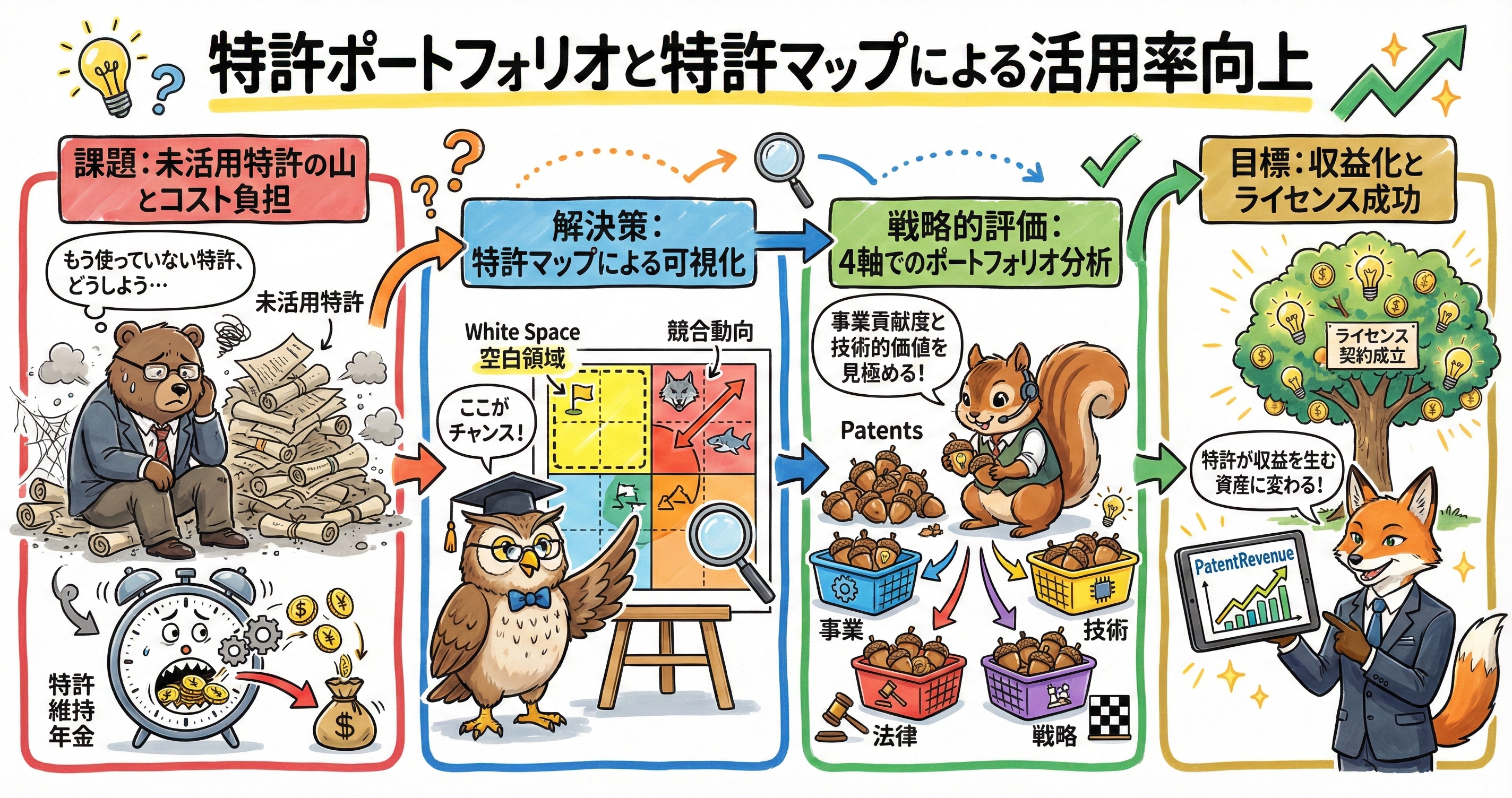 株式会社IPリッチのライセンス担当です。本記事では、大企業が直面している「特許の未活用」という課題を打破し、保有資産を経営の強力な武器へと変革するための「特許ポートフォリオ管理」と「特許マップ」の活用術について、専門的な知見から詳述します。
