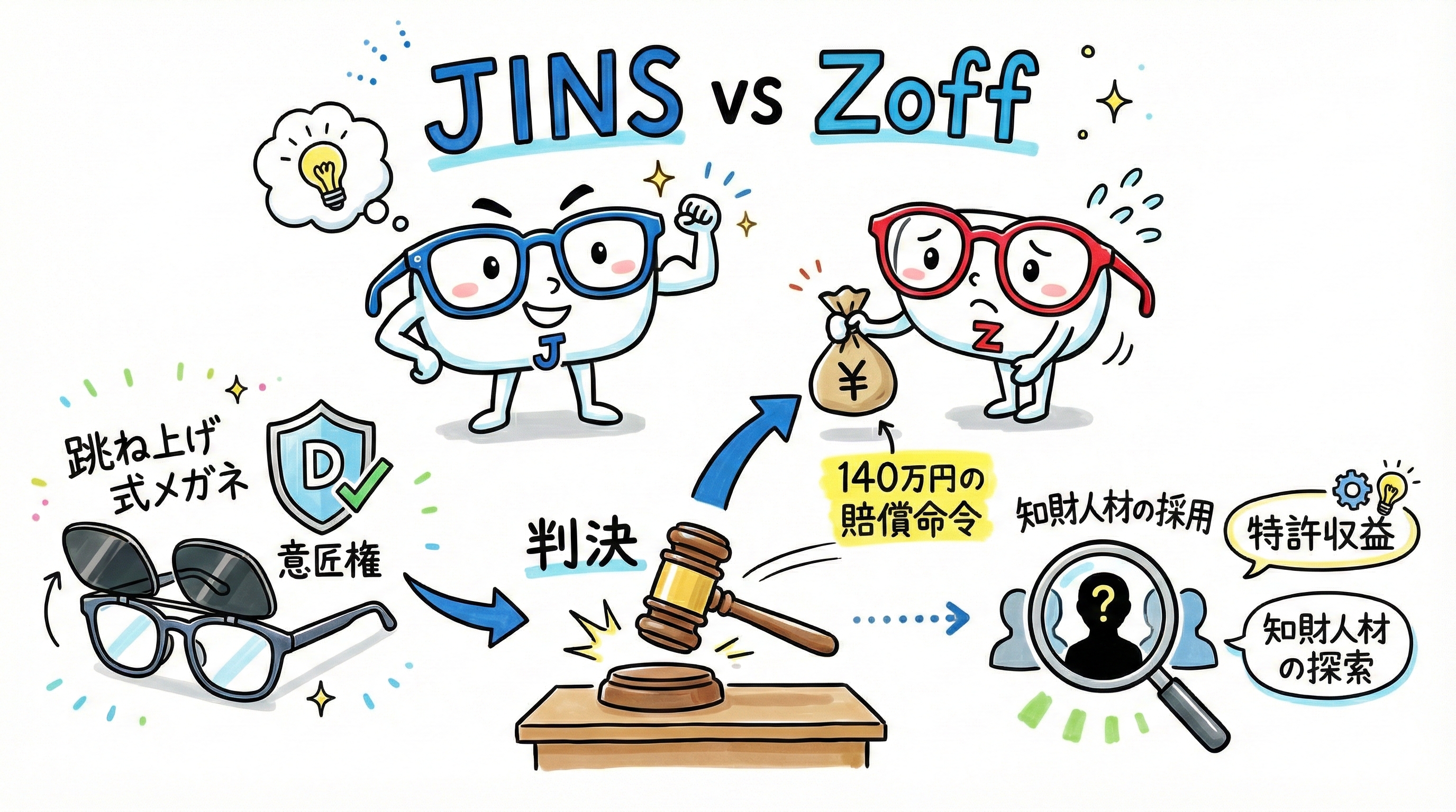 JINS対Zoffの跳ね上げ式メガネ意匠権訴訟は、JINSの勝訴(一部認容)により確定しました。約140万円という賠償額は一見少額に見えますが、その背後には「機能美も意匠権で守られる」という司法の明確なメッセージと、「知財を軽視すればブランド毀損という大きなコストを払うことになる」というビジネスの教訓が含まれています。