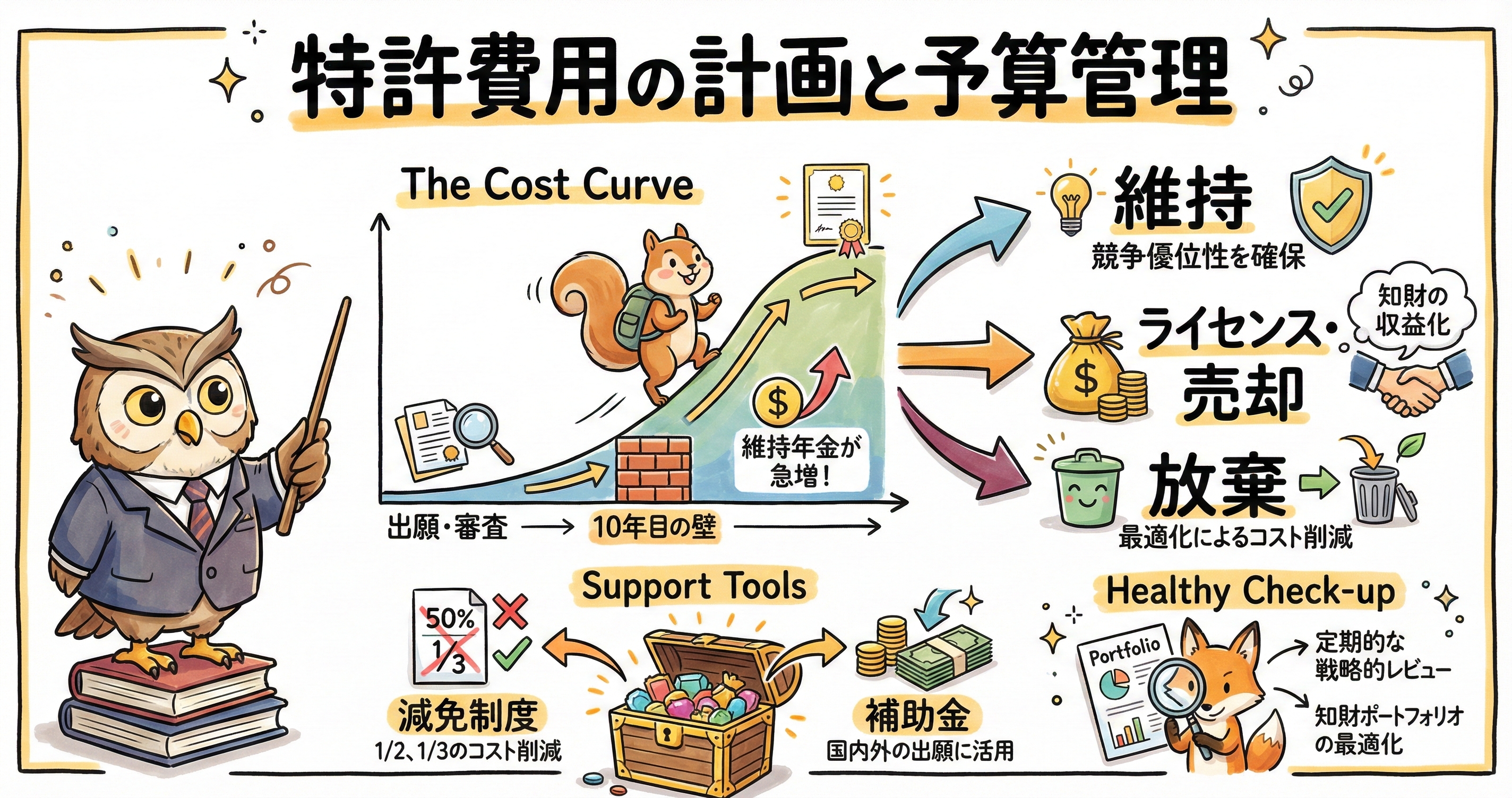 結論として、特許費用の計画と予算管理は、単なる数字の帳尻合わせではない。それは、累進的に増加するコスト構造を理解し、減免制度や補助金といった外部リソースを最大限に活用しながら、自社のポートフォリオを常に最新の事業戦略に適合させていく、ダイナミックな経営判断の連続である。高額な10年目以降の年金負担を恐れるのではなく、それを「権利の真の価値」を問い直す機会と捉え、知財の収益化に向けた攻めの姿勢を維持することこそが、企業の持続的な成長を可能にする。本稿で紹介した手法や視点が、読者の皆様の企業における知財活動の最適化に寄与することを願ってやまない。