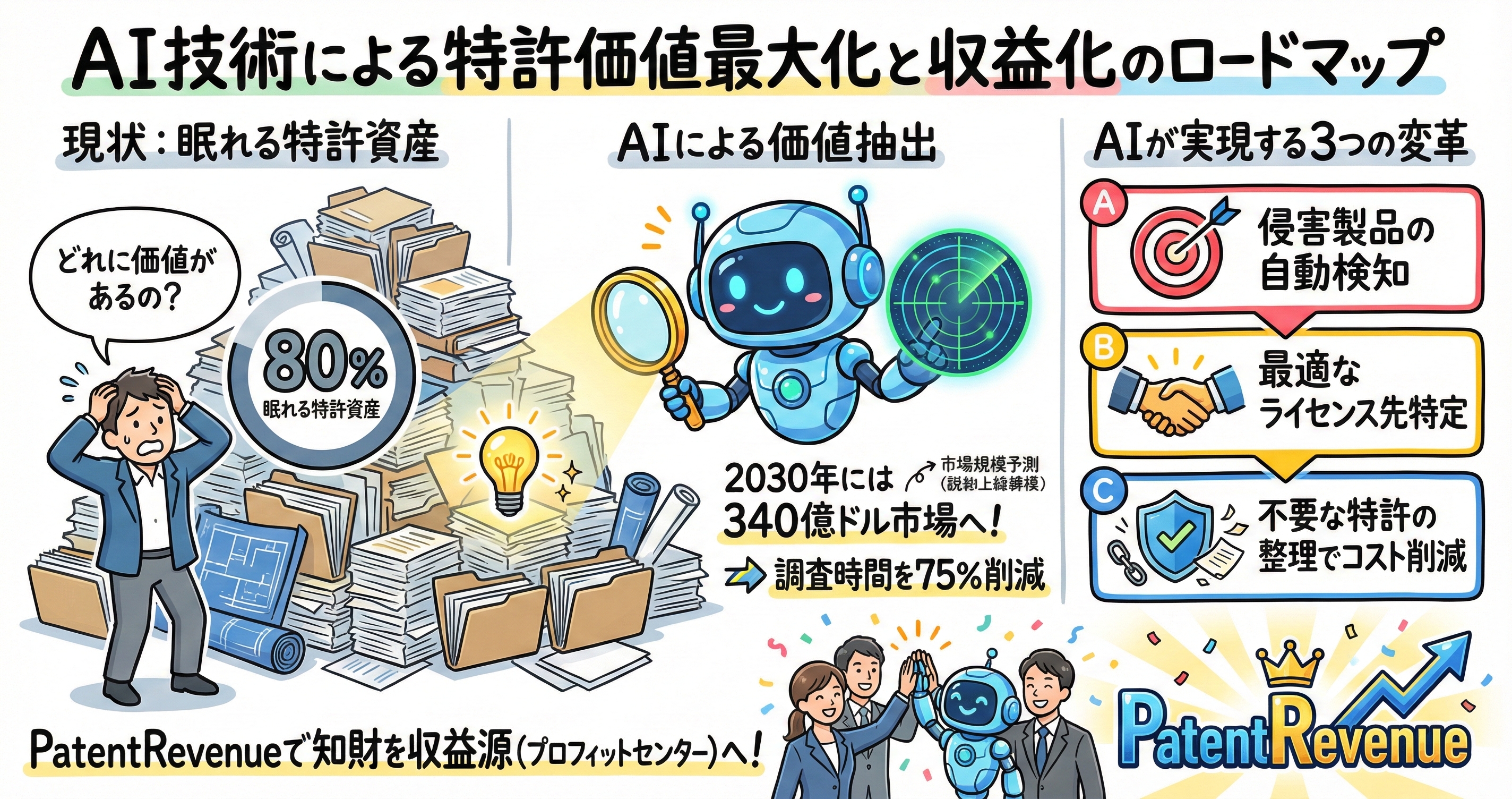 株式会社IPリッチのライセンス担当です。本記事では、特許ポートフォリオの評価および価値抽出のプロセスにおいて、人工知能(AI)がどのような変革をもたらしているかについて、専門的な視点から詳細に解説します。膨大な特許データの中から真に価値のある資産を特定し、戦略的な意思決定を支援するためのAI活用術、および市場の最新動向について、10,000字規模の極めて詳細なレポートとして深く掘り下げていきます。本レポートの趣旨は、特許の約80%が収益を生んでいないとされる現状において、生成AIを中心とした先端技術がいかにして「宝の山」を発掘し、企業の競争力を高める原動力となるかを明らかにすることにあります。