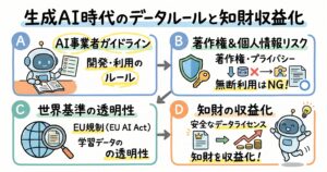 結論として、生成AIは使い方次第で企業の知財創出スピードを速め、業務効率化を劇的に加速させる強力な武器となりますが、その利用の大前提として、自社のコアコンピタンスである「営業秘密」を絶対に守り抜くという経営トップの強固なセキュリティ意識とシステム基盤が不可欠です。エンタープライズ契約による技術的な安全網をしっかりと敷き、不正競争防止法や個人情報保護法などの法的根拠に基づいた厳格な社内ルールを定着させ、従業員全体のAIリテラシーを高めること。この「技術・ルール・人」の三位一体の対策を経営トップの強力なリーダーシップのもとで愚直に推進することこそが、次世代のデジタル競争環境において知的財産を安全に管理し、中長期的な企業の成長と知財の収益化へと繋げるための唯一にして最短のアプローチとなります。
