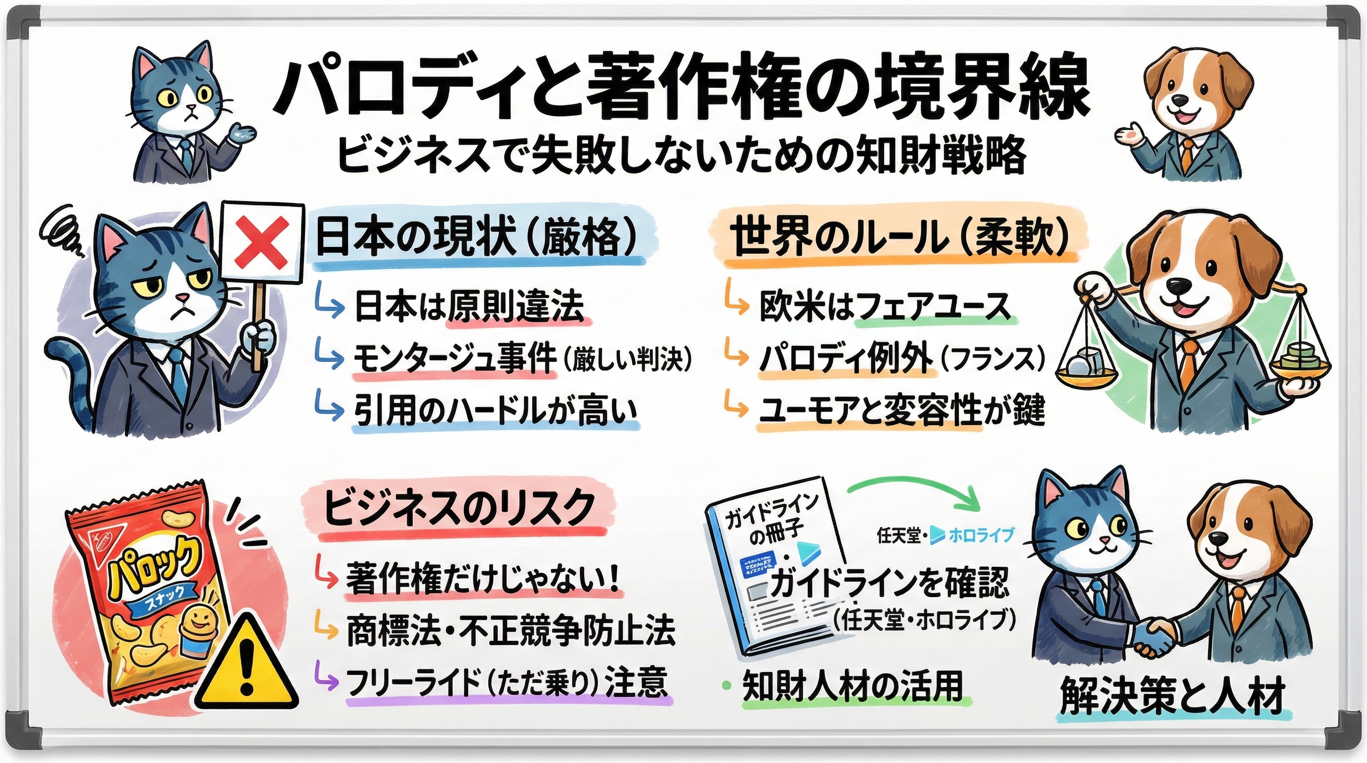 以上の分析から、日本においてパロディ表現やパロディ商品を扱うことは、依然として高い法的リスクを伴う行為であることが確認できました。