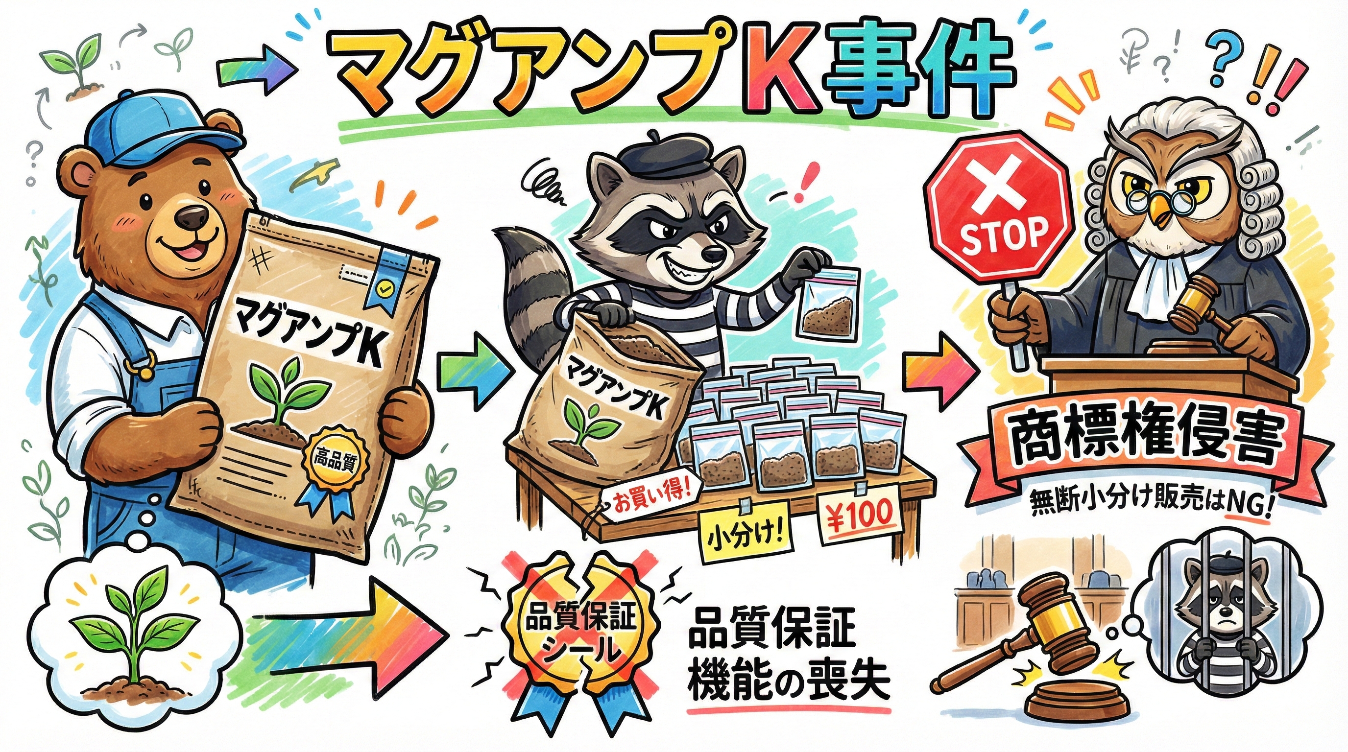 本記事では、園芸用肥料として著名な「マグアンプK」を巡る商標権侵害訴訟(大阪地裁平成6年2月24日判決)を題材に、真正商品の「小分け販売」が法的にどのようなリスクを孕んでいるのかを徹底解説します。一般的に「正規ルートで購入した本物の商品であれば、それをどのように販売しようと自由である」と考えがちですが、知財法務の観点からは、そこに重大な落とし穴が存在します。本件は、登録商標が付された業務用の肥料を購入し、それを独自の袋に小分けして販売した行為が、商標の持つ「品質保証機能」を害するとして侵害認定されたリーディングケースです。企業や個人事業主が、善意であっても知財トラブルに巻き込まれることを防ぐため、この判決が示す法理と実務上の留意点を、専門的ながらも平易な言葉で紐解いていきます。