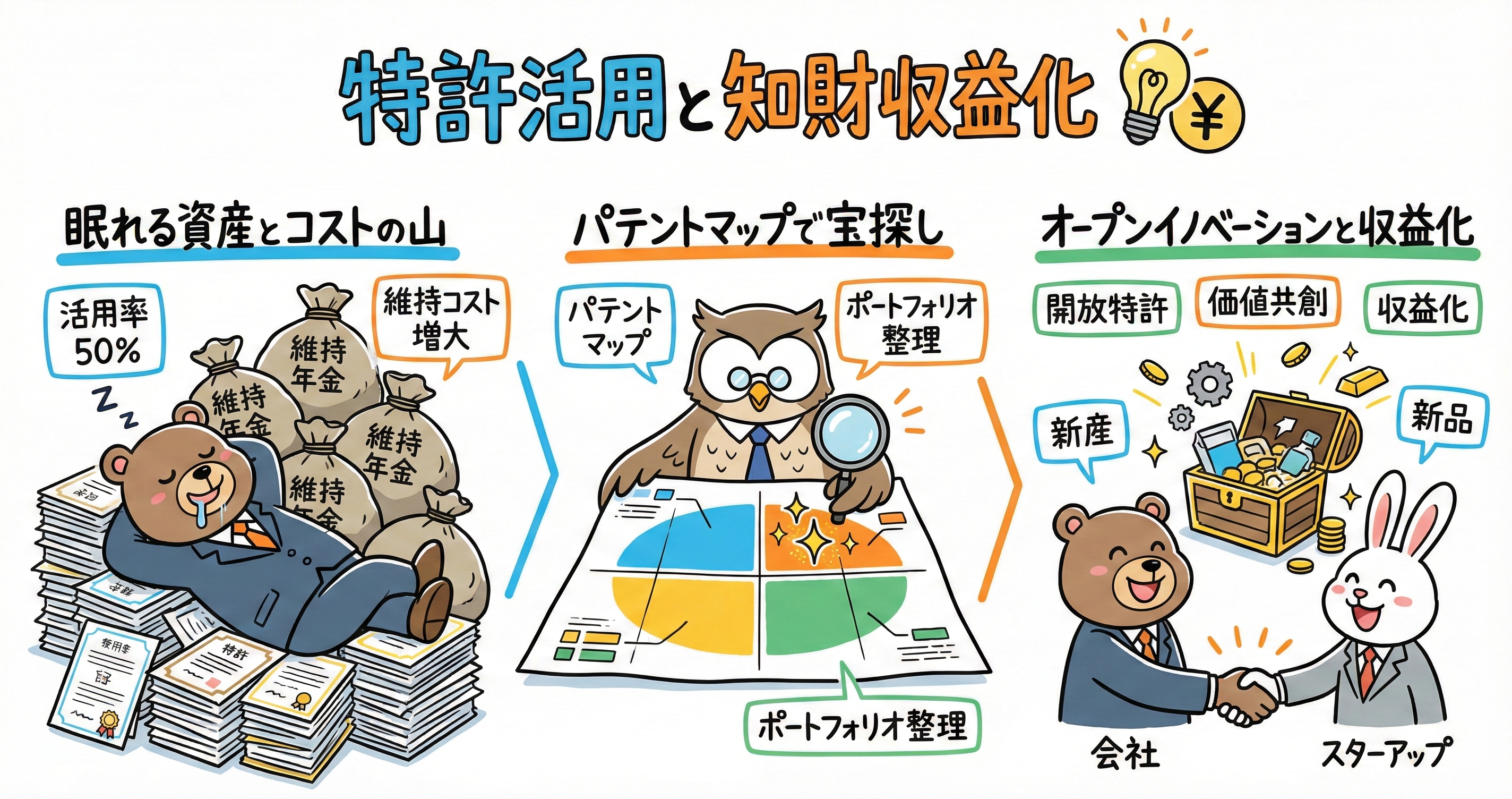 3. 「死蔵」から「開放」への意識改革:「自前主義(Not Invented Here)」からの脱却が必要です。使わない特許はゴミではなく、他社にとっては宝の山(シーズ)になり得ます。開放特許データベースへの登録に加え、コーディネーターや外部のマッチングサービスを積極的に活用し、能動的にパートナーを探す姿勢が求められます。