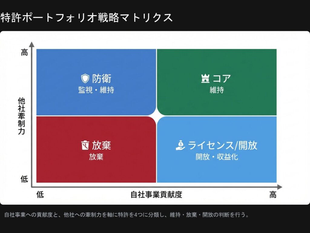 特許マップによって自社の立ち位置が明確になったら、次は個々の特許に対する具体的なアクションプランの策定です。ここでは、ポートフォリオを4つの象限に分類し、維持・放棄・活用の判断を下すフレームワークを提示します。