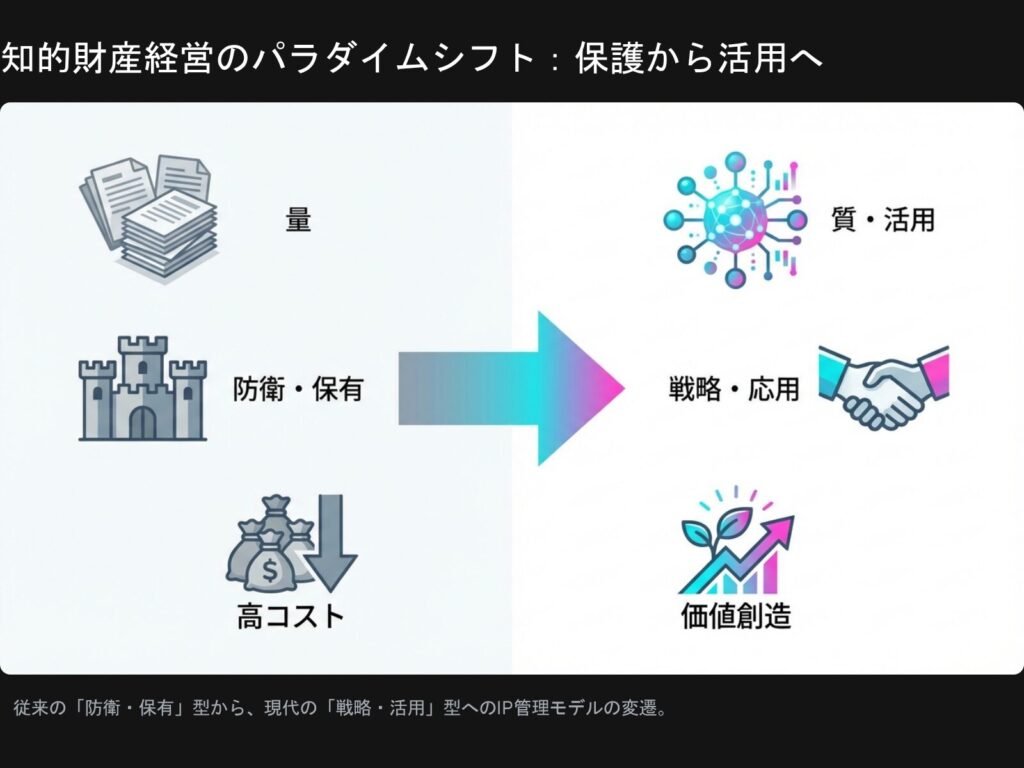 しかし、デジタルエコノミーの台頭、オープンイノベーションの進展、そして技術サイクルの短縮化により、この旧来のモデルは急速にその有効性を失いつつあります。現代のIP経営に求められるのは、単なる権利の「保有」から、事業競争力を創出するための「活用」への転換です。特許権は「守りの盾」であると同時に、他社との提携を引き寄せる「名刺」であり、ライセンス収益を生む「金融資産」であり、そして市場の技術トレンドを読み解く「情報源」でもあります。