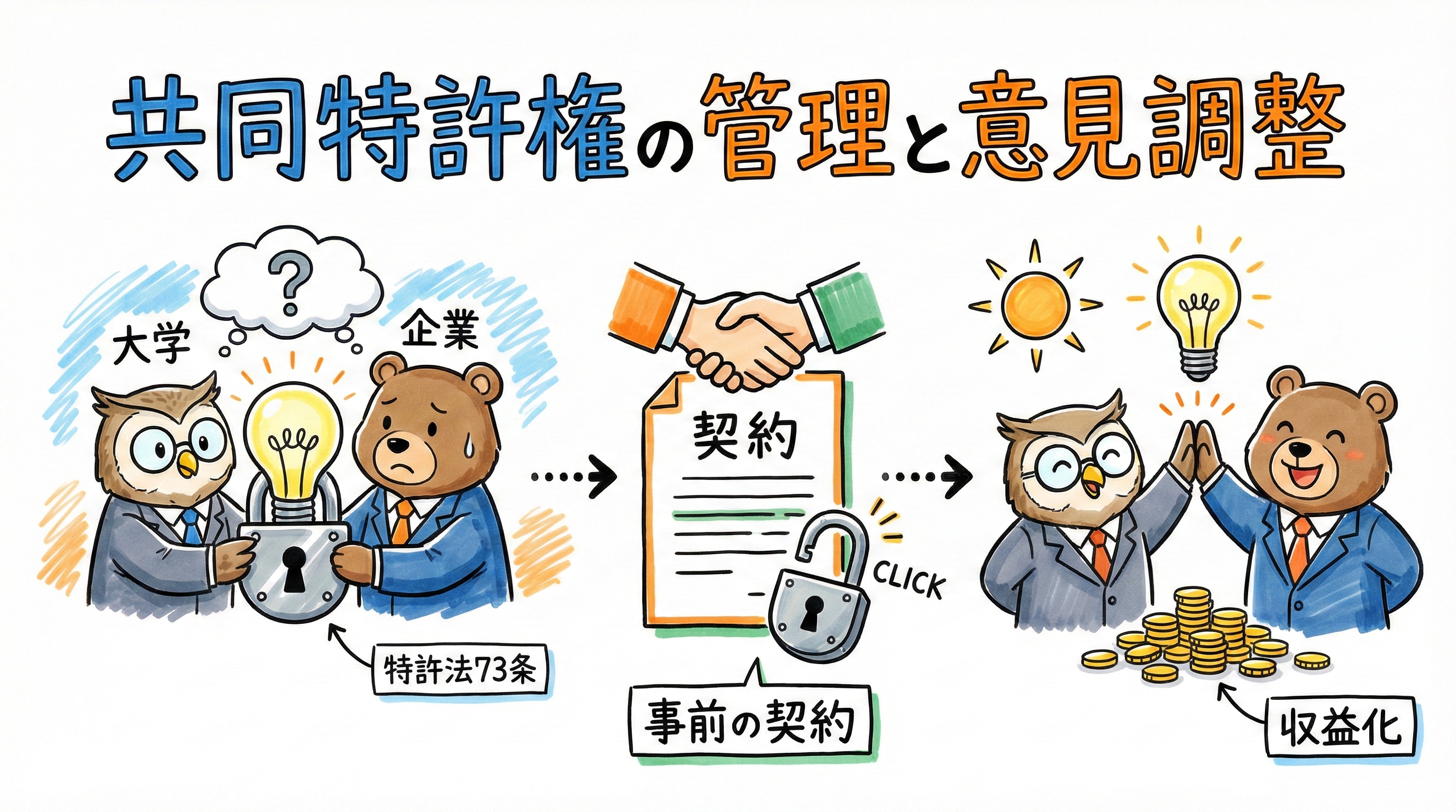 本記事では、企業間の共同開発や産学連携において頻繁に発生する「共同特許権」をテーマに、その管理手法と共有者間での意見調整のポイントについて解説します。技術が高度化・複雑化する現代において、一社単独での技術開発には限界があり、他社や大学とのオープンイノベーションは避けて通れない道となっています。その成果として生まれる特許権は、複数者で共有する「共同特許(共有特許)」となるケースが多く見られます。しかし、この共同特許は、単独で保有する場合と異なり、特許法特有の厳しい制約(特許法第73条)が課されるため、いざ事業展開や第三者へのライセンスを行おうとした際に、共有者の同意が得られずプロジェクトが頓挫する「塩漬け」リスクを抱えています。本記事では、こうした法的制約を正しく理解し、共有者間の利益相反を乗り越え、円滑な意見調整と収益化を実現するための実務的なノウハウを、専門的な視点から平易かつ詳細に紐解いていきます。