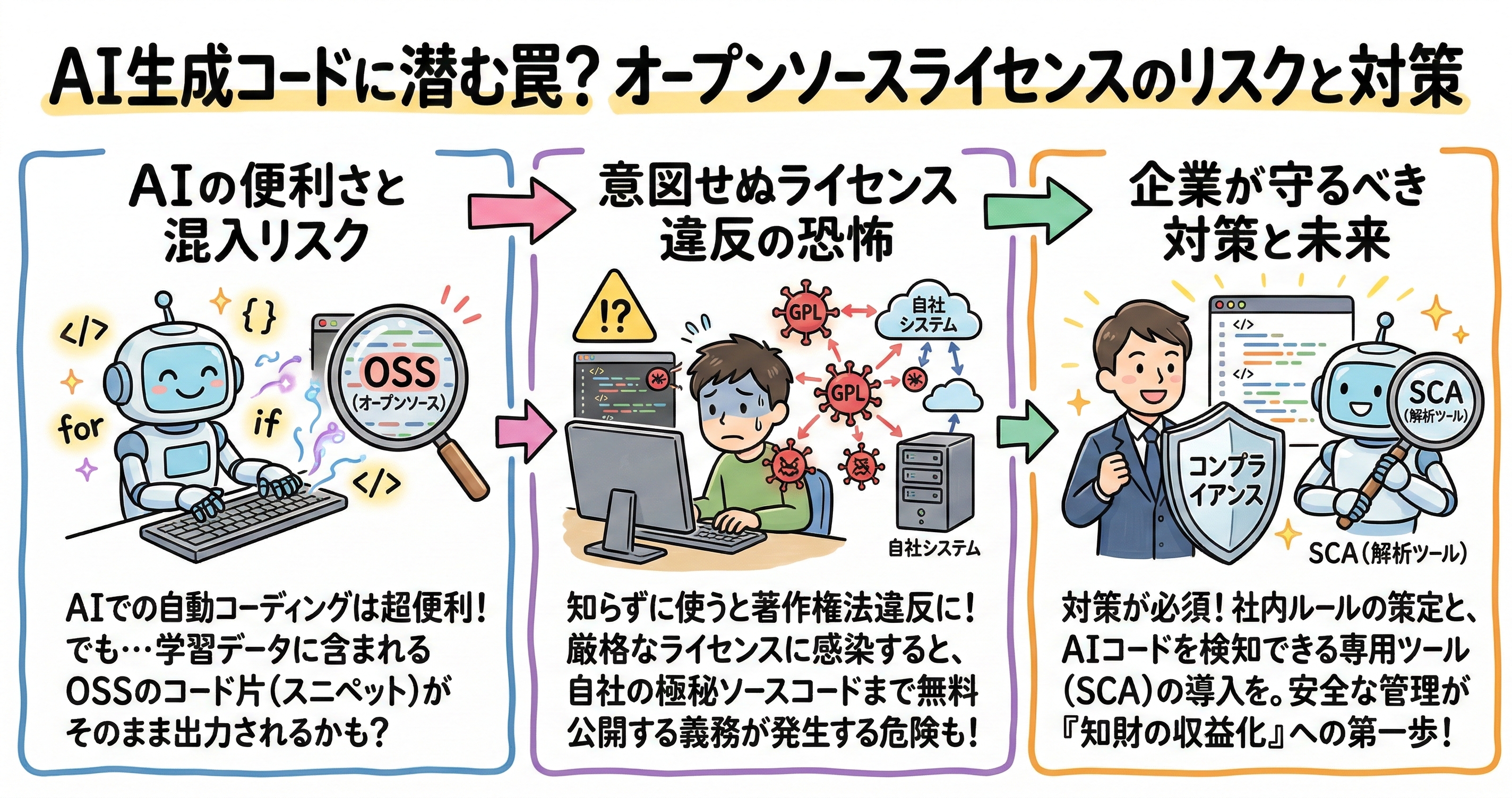 開発者がウェブブラウザ一つで数百万のオープンソースコンポーネントに瞬時にアクセスし、AIアシスタントから提示されたコードをコピーアンドペーストで簡単に自社のプロダクトに取り込める現代の開発環境において、「権利侵害が外部から指摘されてから事後的にソースコードを開示すればよい」といった甘い対応でライセンス違反を防ぐことは不可能です。権利者の許諾条件を満たさないままコードを利用すれば、その瞬間に著作権侵害が成立し、企業の信用は失墜します。AI生成コードのリスクを効果的に管理し、自社の知的財産を安全な状態に保つために、企業は包括的なコンプライアンス管理体制の構築と、専門的な解析ツールの導入を急務として進める必要があります。