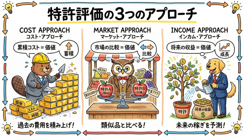 【完全版】特許評価の三つのアプローチ:コスト・市場・収益法の詳細ガイド